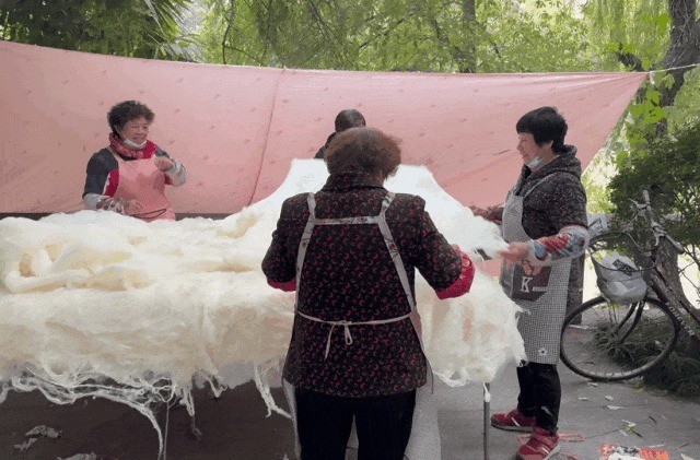 还有桐乡四姐妹每年准时来杭州翻丝绵 那些御冬神器,满满都是回忆 同样在流水苑,还有人和章师傅一样,也在这里弹了20年被子。 来自桐乡的“丝绵四姐妹”,刚好也姓章。每年秋风乍起,章家四姐妹便如候鸟一样准时来到杭城,给大家翻丝绵被。 四姐妹两人为一组,一边晒太阳一边干活,空气里飘着新丝绵的香味。用料扎实,技术也好,原本板结的丝绵被,在她们的处理下很快恢复了松软。 “现在干这行的人很少了,老主顾就认准这种手艺活。”几位阿姨一边说,一边手上也没停着,蚕丝带子在一来一回的巧劲中被扯开,变得薄如蝉翼。 她们今年是国庆节左右来的杭州,消息灵通的人很快就带着被子找过来了,为寒冷的冬天早早做好准备。到11月份,冷风稍微一吹,来翻丝绵的客人明显多了起来,姐妹们就进入到从早忙到晚的状态。“一天做个六七床,一床丝绵被要做两三个小时,有的时候做完路灯都亮了。”